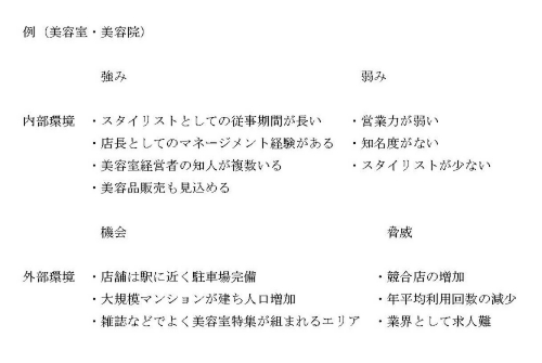 内部環境(自身あるいは自社)における強みと弱み、および外部環境(市場・競合)における機会(自身あるいは自社にとって有利な市場要因)と脅威(自身あるいは自社にとって不利な市場要因)、計4項目をそれぞれ列挙し、経営方針を模索してみて下さい。